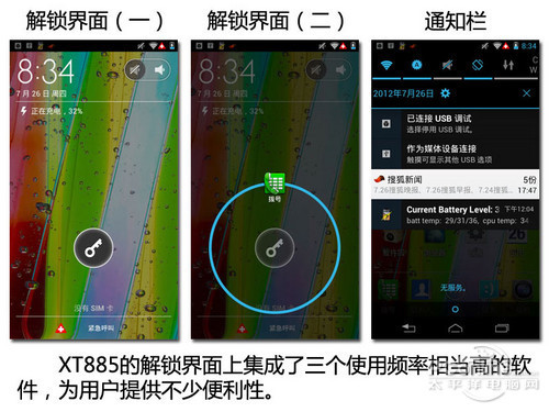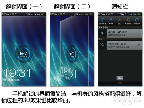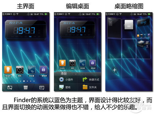 Finder的解锁界面华丽程度比XT885的更高,整个屏幕都是Finder的解锁区域,操作起来很轻松,但界面没有集成XT885中的快捷方式,实用性有待加强。