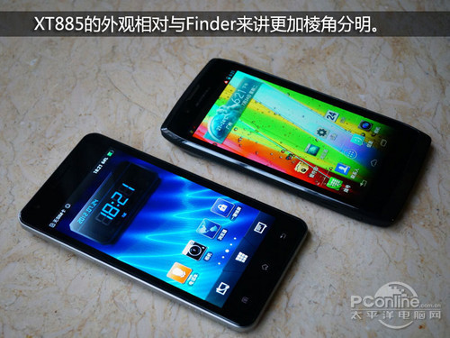 同为厚度非常薄的手机,两机都表现出应有的时尚气息,但两机相比起来,Finder各方面的设计都更为简约大方,年轻气息比较重,给人的第一印象很舒服,而XT885则展示了在摩托罗拉手机中常常感受的到的商务气息,相对与Finder来讲给人的感觉更为成熟稳重。