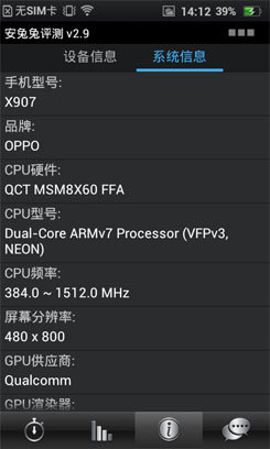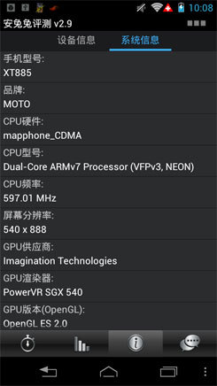 XT885系统界面的底部集成了虚拟按键,占用了一定的像素区域,这从上安兔兔在硬件信息中所示的屏幕分辨率可以看得到。