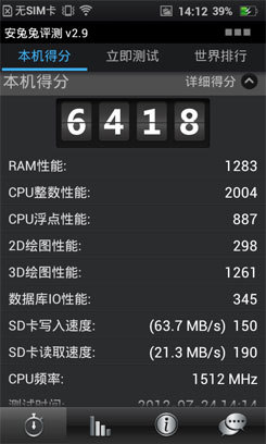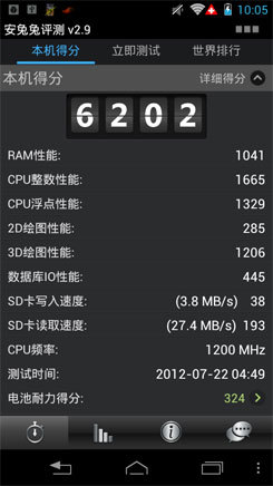 XT885在安兔兔中的跑分表现也是不错的,跑分要比Finder低一些,但两者均属同一等级,与各配置高端的双核机型也是没有太大差距。