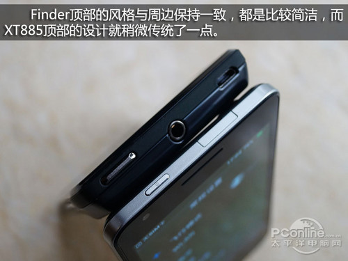 Finder不具备耳机插孔,其顶部只有电源键和数据线接口,但接口上面配备与机身边框同色的防尘盖,这样的设计既能防止异物进入接口,减少屏幕进灰等情况的出现,而且还可以让机身看上去更为美观。XT885的顶部集成比较多的部件,比Finder多了一个耳机插孔。