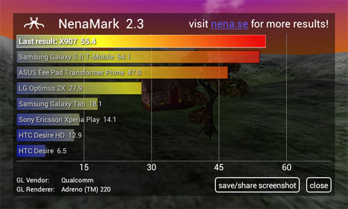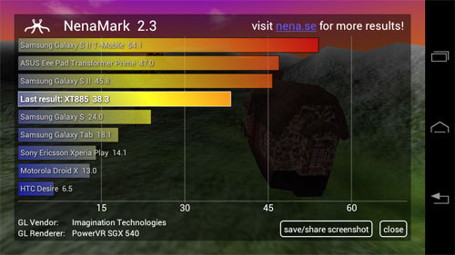 在NenaMark 2.3跑分测试中,两机的差距比较大一些,Finder排在排行榜上的首位,XT885则排在中间位置,不过XT885的GPU PowerVR SGX 540在游戏上面的兼容性还是不错的,实际表现也不会太差。