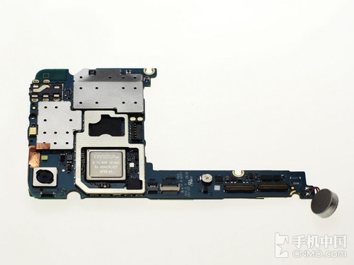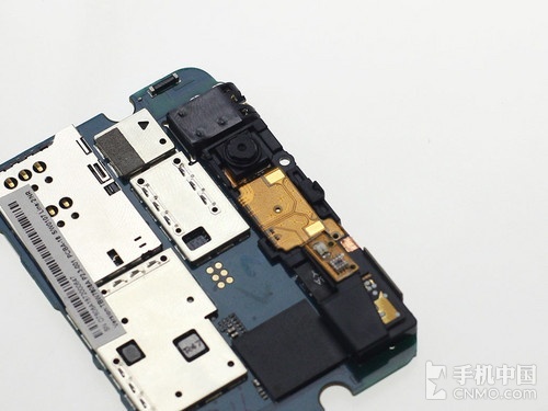 主板背面,这里同样集成了诸多元器件,包括前置摄像头、SIM卡卡槽等等。另外一些器件都被封闭在焊接的屏蔽罩中,所以无法见其庐山真面目。