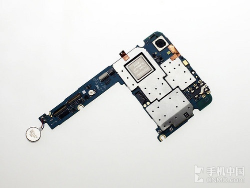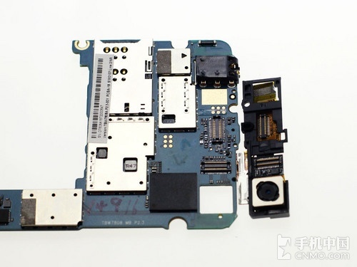 机身主板靠上部位主要集成了摄像头,靠左位置为前置100万像素镜头,右侧为后置800万像素摄像头(镜头在正面位置有显示)。