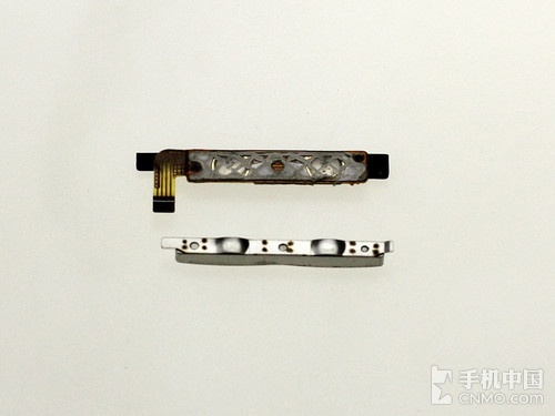 拆卸过程中注意还要将音量调节键取下,它由以下两部分组成,导线和金属按键。导线边缘过渡清晰,按键处焊点精密,做工严谨。