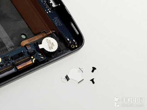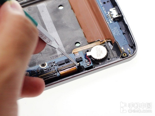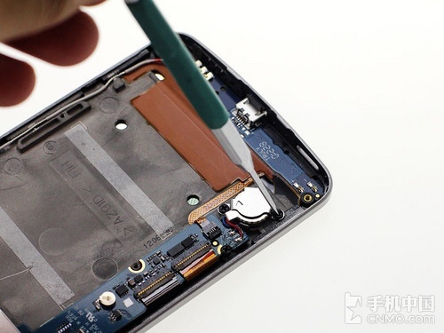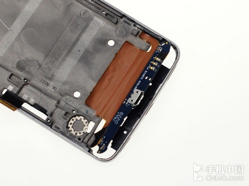 中框最下部分内置了microUSB充电接口相关电路板,它通过贴纸与中框相连并固定。