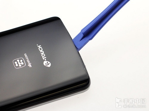 天语大黄蜂II采用一体式机身设计,整体来看似乎没有下手之处,其实不然。手机后盖是通过强力胶与机身背部粘在一起的,我们只需用下面的这只开机卡子在机身底部撬开一条缝隙,然后慢慢沿周围滑动,如此往复,稍微用力翘起,后盖就可以轻松取下。