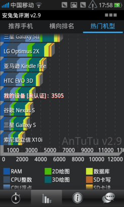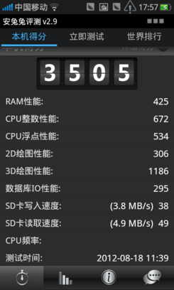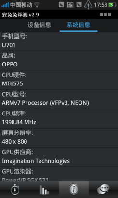 从安兔兔性能测试结果可见,OPPO Ulike U701的表现令人满意的,跑分高达3505,在单核手机中算不错了。