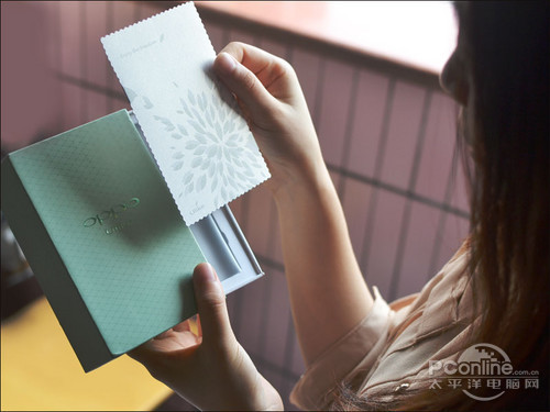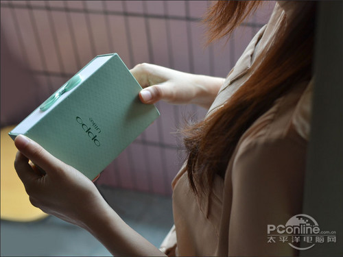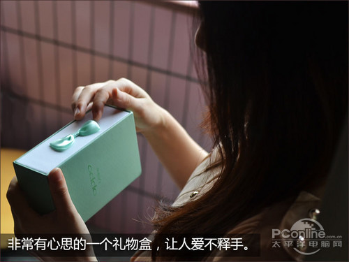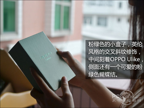 粉绿色的小盒子,英伦风格的交叉斜纹修饰,中间刻着OPPO Ulike,侧面还有一个可爱的粉绿色蝴蝶结。非常有心思的一个礼物盒,让人爱不释手。