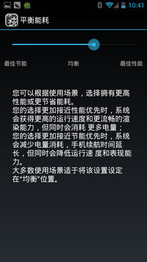 虽然是一款四核智能机,但大多数时候用户可能并不需要处理一些太复杂任务,此时如果机器还是以一个较高频率运行的 话,势必会对本身寿命或是功耗产生一定影响。为更加人性化的操作,大黄蜂II中加入了平衡能耗功能选项,与此前多数产品不同的是,用户可以随意拖动能耗进 度条,而并非只有节能优先、均衡以及性能优先三个选项选择。