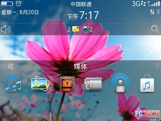 在主桌面的下方是程序列表,显示的内容多少完全可以依据用户的需要。用户可以选择显示一行,两行,以及三行程序列表。当三行时则会占满屏幕。当然,我们也 可以将程序列表隐藏在桌面之下,一行也不显示,当需要时只需要上拉就可以显示出来。同时,左右移动,会发现可以显示更多内容,可分为常用、下载、媒体、收 藏以及全部。其滑动体验十分流畅。