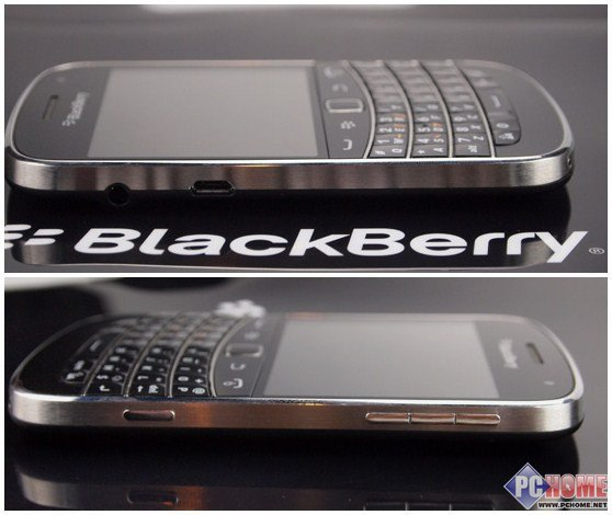 在侧边位置,黑莓bold 9900采用了银色的金属拉丝效果,切割时非常棱角分明的风格,比9000更显精致。而侧边栏上的按键也发生了变化,有原来的左右各有一个快捷键,变成了 一个快捷键。对于喜欢拍照的用户可以将它设定为拍照键。当然,你也可以设置为其他的常用功能键。而在音乐播放上面进行了加强,有原来的的音量增和音量减增 加到了播放暂停键。而按键集中在了机身的右侧,左侧则集中了两个接口,标准耳机口和microUSB标准接口。