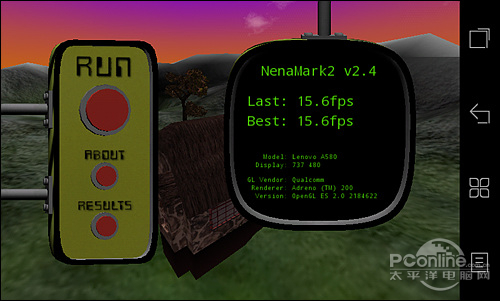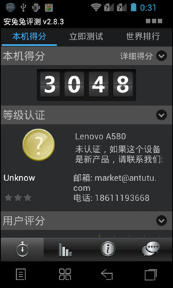 可以看到,联想乐Phone A580的安兔兔跑分为3048,排在三星Galaxy s前面;Vellamo得分是425;NenaMark 2得分是15.6fps。虽然乐Phone A580的跑分不算很强劲,但在单核手机中已经不错了,而且只卖这样的价格。