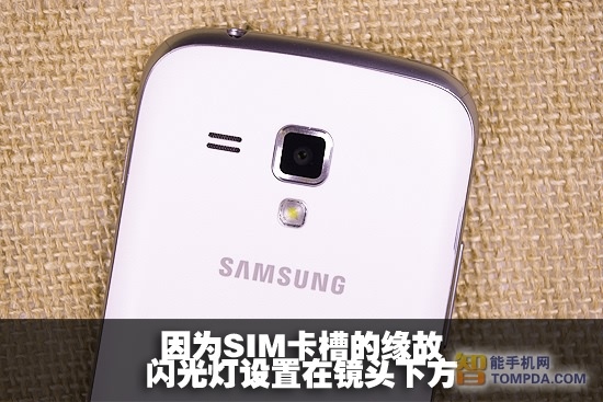 由于该机SIM卡槽位置的变化,LED闪光灯与Galaxy S3 mini一样移到了摄像头下方,而且三星S7562是双卡双待手机,SIM卡槽也被设计成层叠式也减少占用的空间。