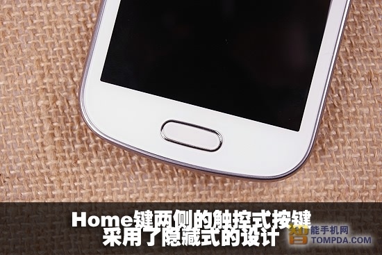 三星 S7562在屏幕上方的设计与Galaxy S3 mini相同,都是将前置摄像头、距离感应器和光线感应器设计在了听筒左侧,在屏幕下方,依然是充满三星风格的设计,中间是一个物理按键,两侧是两个触控 式按键,并且采用了隐蔽式的设计,在没有背光灯的情况下是看不到他们的。
