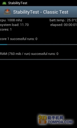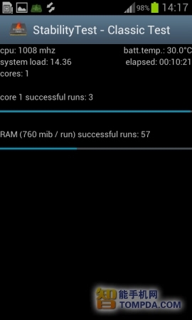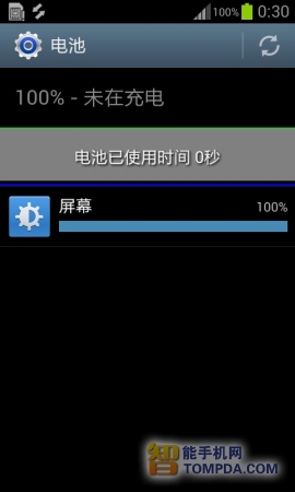 最开始,CPU的温度为25℃,这与大多数Android手机的待机温度是大致相同的。经过5分钟之后,CPU的稳定上升至29℃,10分钟之后上升至30 摄氏度,之后CPU的稳定一直稳定在30℃没有继续上升。在CPU处于满载状态下30分钟之后,电量由100%下降至93%。