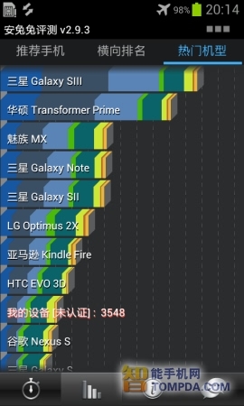 三星S7562在Quadrant中得到了2539分,Neocore的成绩为57.2帧,安兔兔评测中也得到了3548分的成绩。通过图片我们不难看出, 三星S7562在Quadrant与安兔兔中的位置相差比较大,在Quadrant中几乎达到了谷歌三太子和LG Optimus 2X的双核水准,而在安兔兔中只有谷歌二太子的水准。