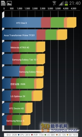 不过这并不影响该机的整体水准,如果不考虑分数,该机在使用中的实际表现并没有明显的卡顿,因为有768MB RAM的支持,Android 4.0系统下压力并不大,但如果用户后台程序过多的话,一些小卡顿的现象在所难免,毕竟是单核的处理器。