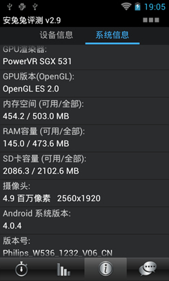 从以上配置可看出,飞利浦W536搭载联发科MT6577双核1GHz的处理器,并集成有PowerVR SGX531的GPU,配合512MB RAM和4GB ROM存储组合,综合配置主流,拥有比较强悍的性能,保障系统的流畅性。。