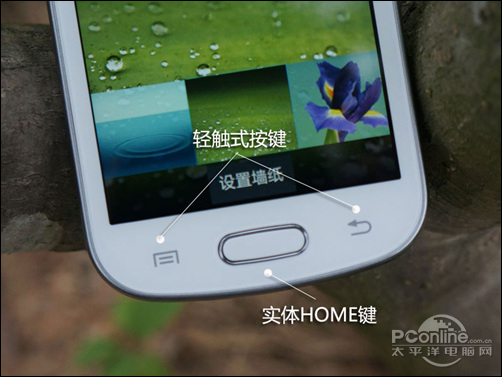 三星S7562i沿用了GALAXY系列手机的设计风格,保留了实体键的同时,home键设计更小更圆润,而左右分别是菜单键和返回键,采用实体图案标记,在黑暗中并不会发光。