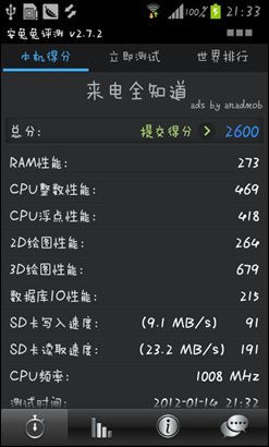 在这个环节,笔者采用几款不同的测试软件对三星S7562i进行跑分。