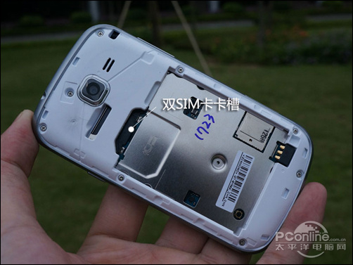 通过机身右侧的开槽口能够掀开手机后盖,可以清晰观察机身内部卡槽口的位置,从实物图片中可以得知三星S7562i设置有双SIM卡卡槽,双卡槽上下分布位于电池区的上方。