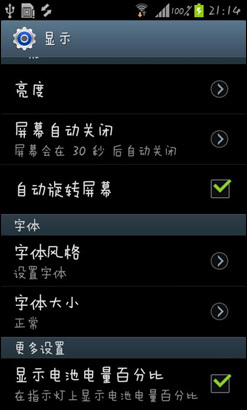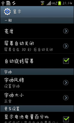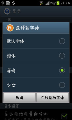 在设置界面能够设置系统字体,三星S7562i内置四种字体风格,分别有默认字体、楷体、喵呜、少女,另外用户能够通过连接WIFI在线下载更多的字体风格。