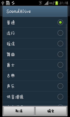三星S7562i的音乐播放界面与原生播放器差别不大,而在音效设置上内置十数种不同的音乐效果,可选择性高。