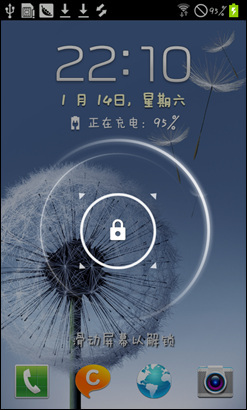 解锁界面布局更加简单,屏幕下方有四个快捷按键,点击对应的图标滑动屏幕即能打开该程序。