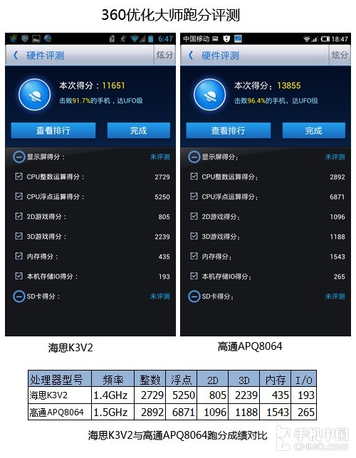 当然,为了更客观体现海思K3V2的实力,我们还是决定寻找一些测试工具来进行性能测试。本着认真负责的态度,笔者尝试了另外一些国内 主流的性能测试软件,结果发现360优化大师并没有受到限制。下面我们来看一下海思K3V2(荣耀四核爱享版)和APQ8064(小米手机2)在这款跑分 软件下的测试结果对比。