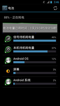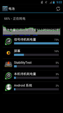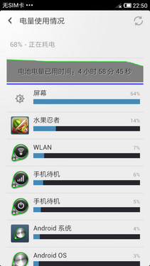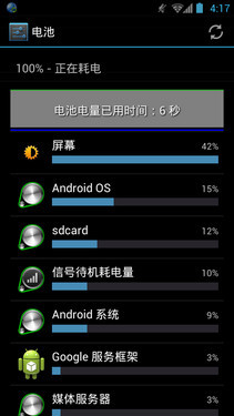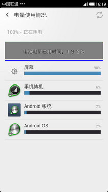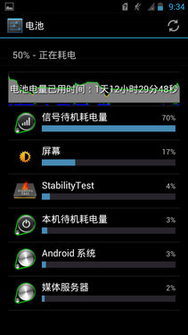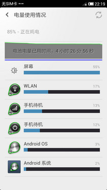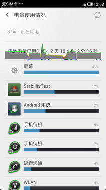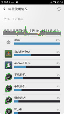 上图为荣耀四核爱享纯待机模式下的耗电情况,待机时长共47小时28分钟,共耗电约12%。荣耀四核爱享的电池为2230mAh,也就是说总耗电量为268mAh,平均每小时耗电约5.6mAh。