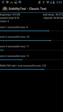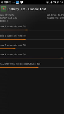 对于CPU发热情况,我们先是通过StabilityTest软件(稳定性测试)来对其高负荷运行中的温度变化进行测试。我们选择 “Classic Test”模式,对荣耀四核爱享版和小米手机2两款手机同样的条件下(关机一段时间待机身完全冷却之后,开机而不运行其他程序)同时测试10分钟,结果显 示,荣耀四核爱享版的温度达到了45℃,而小米手机2的温度达到46℃。从这一结果来看,海思K3V2的表现可以说是比后者稍好,但这样的温度表现显然都 不太尽如人意。