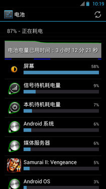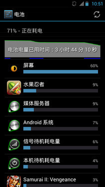接下来我们再测试一下该机玩游戏时的耗电情况。我们选择《水果忍者》游戏,两款手机各玩30分钟,左图为测试前的电量情况,右图为测试后的电量情况。