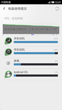 上图为小米手机2纯待机模式下的耗电情况,待机时长共47小时28分钟,共耗电约24%,小米手机2的电池为2000mAh,总耗电量480mAh,平均每小时耗电约10.1mAh。