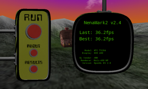 NenaMark2是持续流行的NenaMark1更先进的图形效果和更高分辨率的图形的OpenGL ES 2.0的基准。与许多其他基准不同,NenaMark测量性能而可以采取从一个典型的游戏的结果,并提出在每秒帧数,即提供一个直观的性能的数字,可以用 于在不同装置之间的实际比较,使用逼真的场景。从各种各样的设备的基准测试结果是可在NenaMark网站上查询。HTC One SC的NenaMark2测试成绩为36.2fps,说明其3D处理能力是不错的。