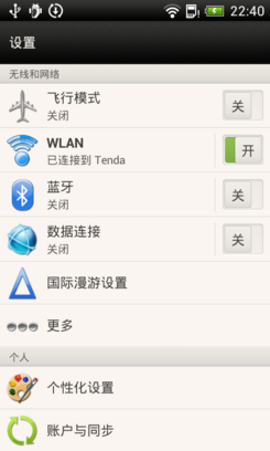 下拉可调出顶部通知栏,HTC One SC的顶栏设计将通知和快捷设置分成了两个部分,在下拉栏的底部可以进行切换,快捷设置可对常用的WLAN、蓝牙等进行快捷开关,更多的设置选项可在右上角的设置按钮进入设置界面进行。HTC One SC在界面美观设计上这次化繁为简,特别是顶栏颇有点MIUI的影子。