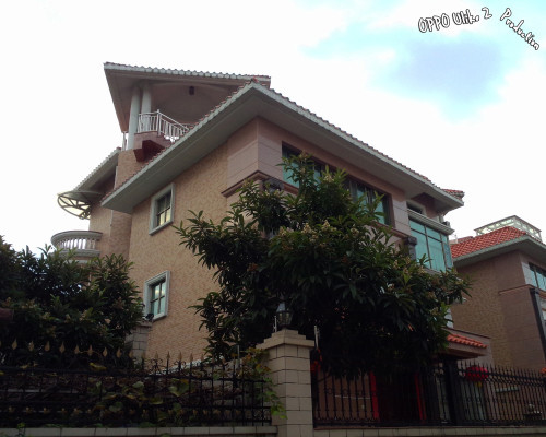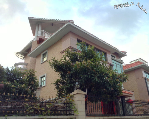 HDR拍摄模式近来相当受用户的喜爱,当使用HDR拍摄时,相机会同时拍摄产生一组两张不同曝光度的照片(一张正常曝光,一张增强或减弱曝光),当周围光线环境较暗时,通过增强曝光以获得合适的照片。以下两张对比样张为早晨7点时分光线较暗时拍摄,通过对比我们很容易发现,开启HDR后,拍摄主题的细节显示更足,房子前方的树和上方天空明显可以获得更多细节表现。