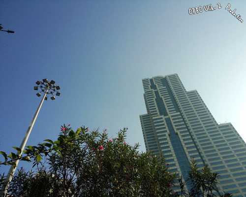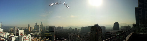 接近上午十点,在公司30楼楼顶获得全景拍摄样张,现场光线十分强烈。全景拍摄是通过获得多张横向的拍摄样张经智能优化并而合成全景照片的拍摄功能。下图的全景拍摄样张,随着相机的横向平移,阳光先从侧面到正面使相机进光量越来越大,以致使得拍摄样张左半部分和右半部分天空色彩有所差异。