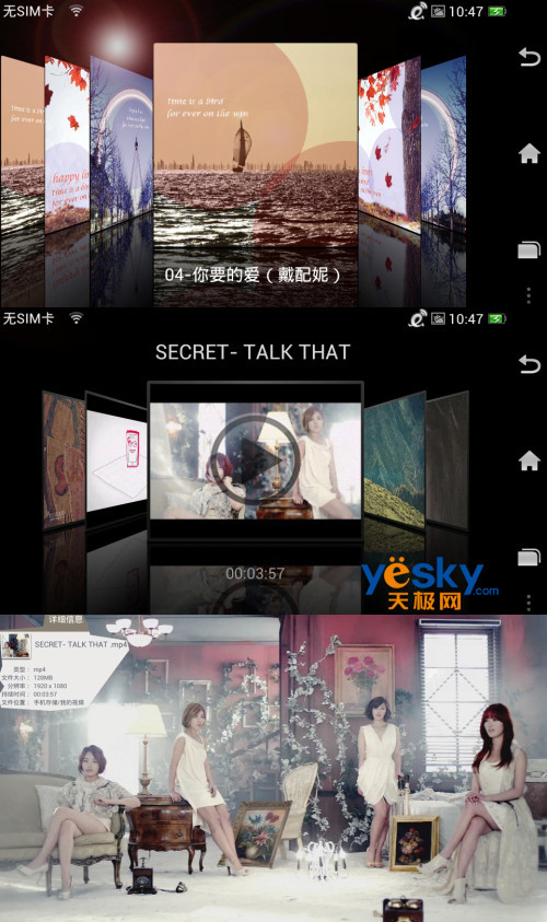 OPPO Ulike 2的影音播放界面设计简约美观,可根据重力感应自适应横竖屏,当适应为横屏时,界面以滑动预览界面示人,可方便左右切换并进行播放和暂停操作。音乐播放方面Ulike 2支持MP3/AAC/AAC+/MIDI/WAV/AMR/APE/FLAC等音频格式;视频播放方面则支持MP4/3GP/RMVB/AVI/RM/MKV/FLV等视频格式,而且在播放1080P高码率视频时,Ulike 2的表现还是相当流畅。