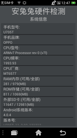 硬件方面,OPPO Ulike 2虽定位为女性专属时尚用机,但整体配置仍算较为出色。1GHz双核处理器和1GB大内存组合,极大地保证Ulike 2的多任务处理和多网页浏览能力,安兔兔硬件检测中屏幕分辨率为540*888,与qHD(540*960)有差异是因为Ulike 2在用户界面中集成了一个540*72大小的虚拟按键块,其实际屏幕分辨率依然是qHD级别。