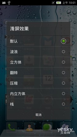 nubia Z5系统基于最新的安卓4.1.2,采用深度定制的个性化界面,具有多种特色功能。锁屏界面的解锁点延续了红圈设计,下方有两个快捷功能拍摄与音乐。拖动解锁圈一秒后进入桌面,按动选项键或按住桌面可进行个性化DIY设置,改动壁纸、滑屏效果等。
