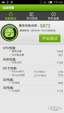 nubia Z5采用高通骁龙SnapdragonAPQ8064平台,四核Krait架构,Adreno320图形处理器,双通道533MHz2GB内存,32GB ROM,配置属于当前旗舰级。在性能测试方面我们采用软件跑分来进行对比,本次评测所用软件有安卓评测、象限大师(Quadrant)。安兔兔由于多数厂 商对其进行特殊优化,其跑分对比意义已经不大,此处不作重点考察,不过我们提供数据,跑了几次成绩分别从13000+到19000+不等。