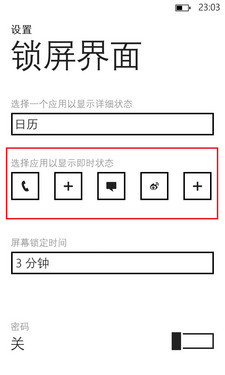 除了锁屏背景,Lumia 820现在还能定制在锁屏界面上显示的即时状态了,目前WP8系统最多可以在锁屏界面上放置5种即时状态,除了我们常用的电话、短信、手机、游戏外,最新版的新浪微博也是能够被添加到锁屏界面中了。