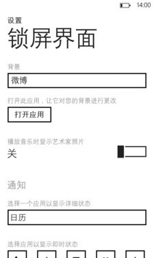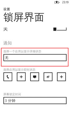 此外,我们还可以选择一个应用以让它可以在锁屏界面上显示详细状态。目前Lumia 820能够支持日历、手机、天气以及短信的选择。