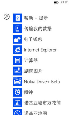看完了Lumia 820的桌面,下面我们再聊聊它的程序菜单吧。与WP7一样,Windows Phone 8采用了同样的程序菜单,用户在桌面直接向右一滑就能直接来到程序菜单了。不过比较遗憾,Windows Phone 8的程序菜单依旧不支持多页分屏,不管安装的应用程序有多多,我们只能一直沿屏幕下面从首字母A到Z滑动以查找下面的应用程序,好在系统在左上方放置了一 个搜索选项可以让我们输入应用名称以直接查找应用。