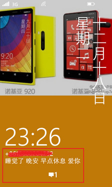 Lumia 820的动态应用(Live App)功能说白了就是除了系统自带的那些日期、短信提示外,它还可以在锁屏界面可以显示第三方应用的通知,如最新的新浪微博就加入了对动态应用(Live App)的支持。