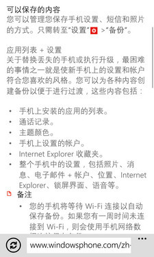 除了照片及短信这种基础的云端备份外,Lumia 820还支持应用程序列表及一些设置选项的备份。根据提示我们可以将通话记录、主体颜色、IE浏览器收藏夹、锁屏界面设置等备份到云端,日后用户直接通过微软账号就能将这些内容一键还原。
