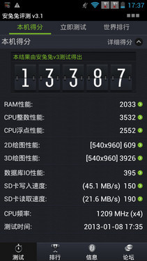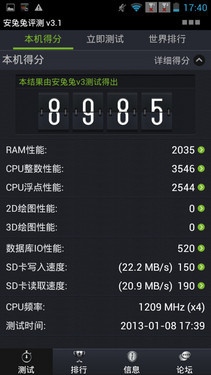 俗话讲光说不练假把式,所以笔者也就不能免俗的用性能测试软件对MT6589进行了测试,本次我们选用的是目前最新的安兔兔评测软件3.1版本。