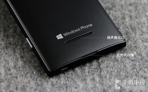 除了华为的标识之外,在W1的机身背面还印有微软Windows Phone的Logo,再次表明了该机的系统身份,而Windows Phone标识下方则是扬声器出口。值得一提的是,华为W1的后壳可以直接拆卸,而且在机身底端还设计了一个后壳开启槽,为用户开启后壳提供了便利。