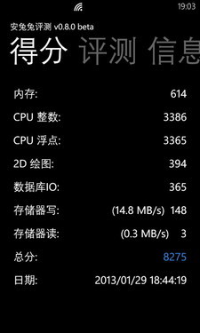 在安兔兔评测软件的基准跑分测试中,华为W1的总得分为8275分,相比之前评测的几款旗舰级Windows Phone 8手机确实存在一定差距,毕竟该机仅是一款售价1599元的中端产品,而且运行内存(RAM)为512MB。